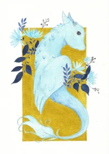 Tu sais, celui-là, il est né un matin de janvier, quand le froid dehors dessinait des fleurs de givre sur ma fenêtre. J’avais envie de capturer quelque chose entre l’eau et la glace, une créature qui serait faite des deux à la fois — et c’est lui qui est apparu sur le papier, tout en douceur, dans ces bleus pâles qui rappellent la surface d’un lac gelé. Je l’ai laissé émerger lentement, couche après couche, en travaillant le blanc du papier coton pour faire briller ses écailles comme si la lumière les traversait vraiment.