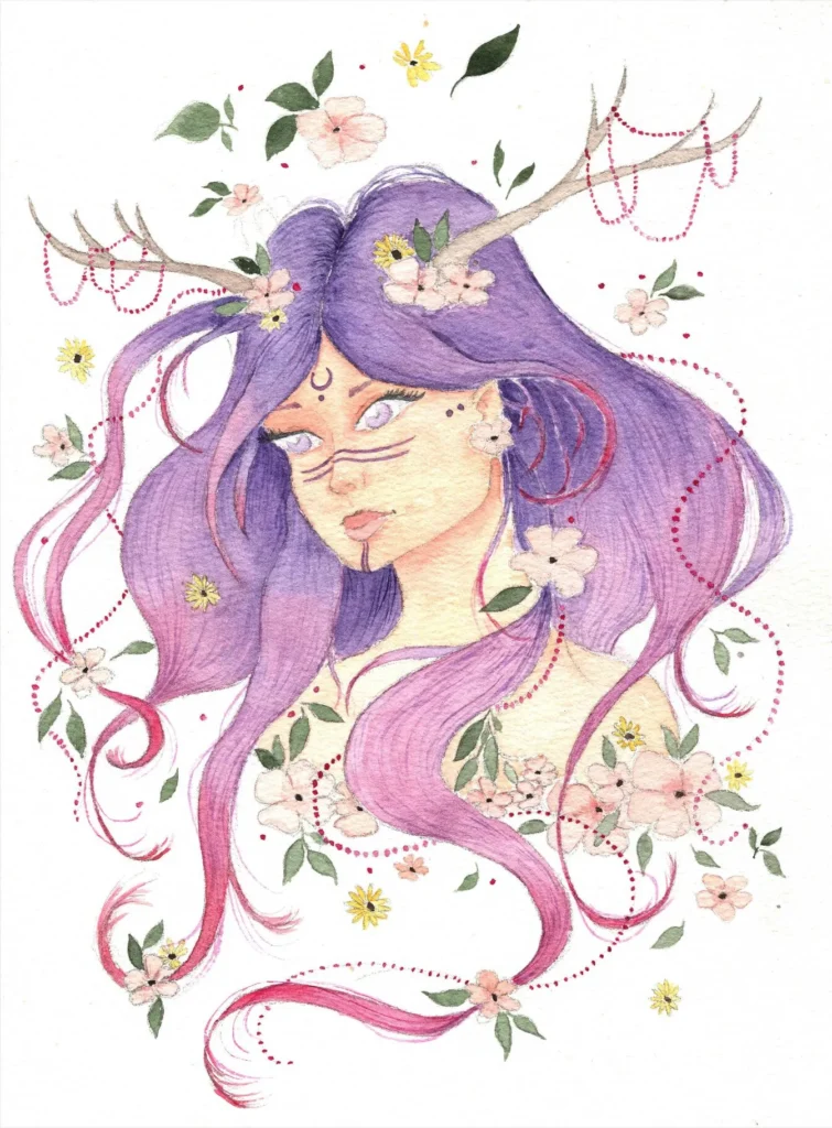 Elle est apparue comme ça, presque d’un souffle — une völva, une prophétesse des anciens temps nordiques, mais habillée par le printemps. Je voulais peindre une figure qui porte à la fois la magie et la douceur, quelque chose d’ancien et de fleuri en même temps. Ses bois de cerf s’élancent vers le ciel, chargés de petites fleurs pâles et de feuilles vertes, et ses longs cheveux violet-rose se déversent autour d’elle comme une rivière en crue — c’est ce dégradé, ce passage du mauve profond vers le rose vif, qui m’a donné le plus de bonheur à peindre. Les petits chapelets de perles grenat qui s’enroulent dans la composition, ce sont ses fils invisibles, ceux qu’elle tire pour lire le destin.