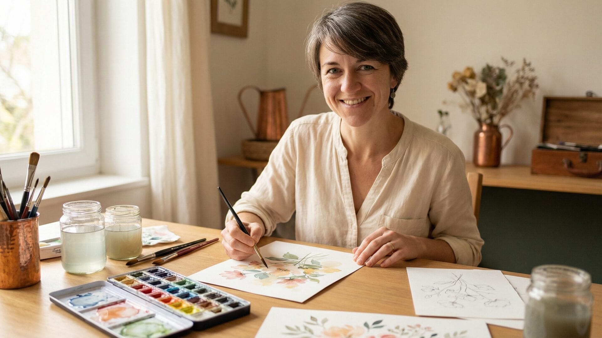 Chaque cours inclut une fiche matériel avec les recommandations de Kim. Pour débuter, un petit set d'aquarelles, quelques pinceaux et du papier suffisent. Pas besoin d'investir beaucoup au départ.